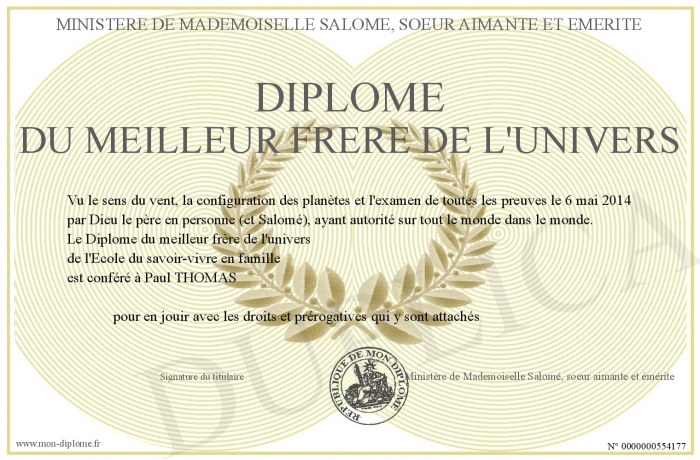 Envoyez par email votre Diplôme du meilleur frère de l'univers personalisé