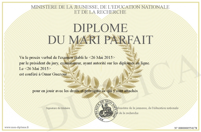 Envoyez par email votre Diplôme du Mari parfait personalisé