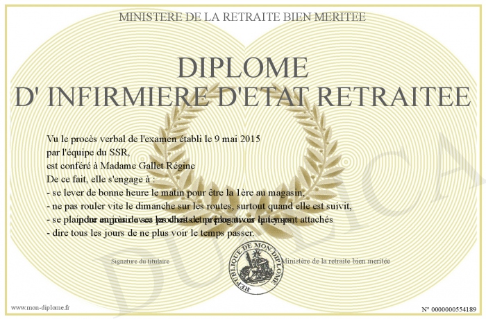 Envoyez par email votre Diplôme d' infirmière d'état retraitée personalisé