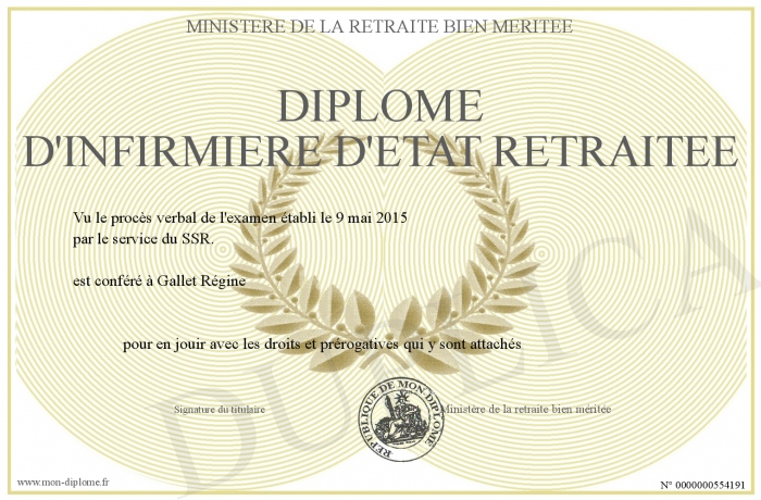 Envoyez par email votre Diplôme d'infirmière d'état retraitée personalisé