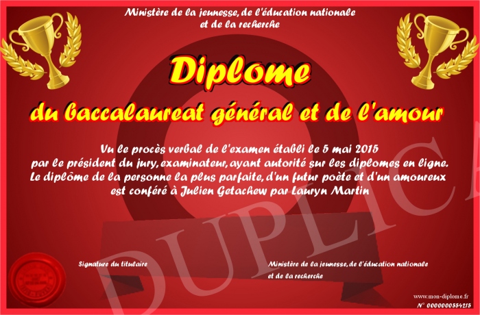 Envoyez par email votre Diplôme du baccalaureat général et de l'amour personalisé