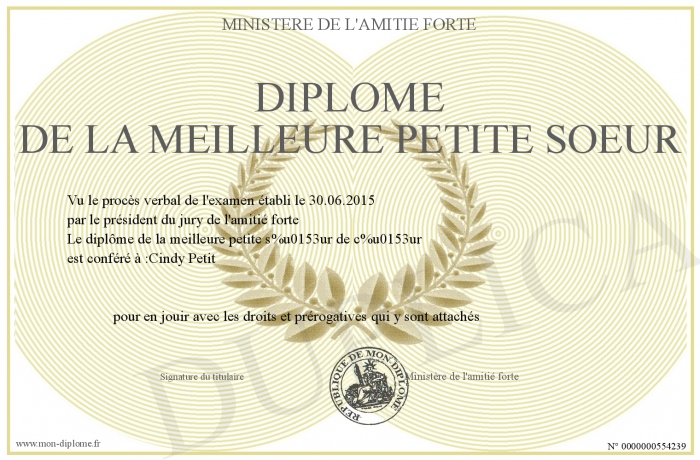 Envoyez par email votre Diplôme de la meilleure petite soeur personalisé