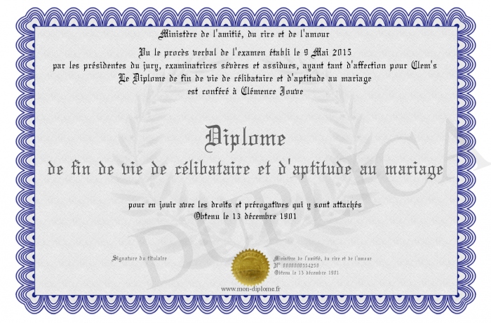 Envoyez par email votre Diplome de fin de vie de célibataire et d'aptitude au mariage personalisé