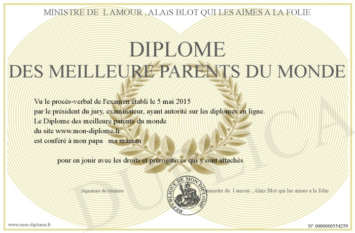 Envoyez par email votre Diplôme des meilleure parents du monde personalisé