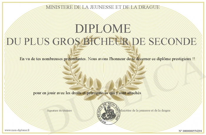 Envoyez par email votre Diplôme du plus gros bicheur de seconde personalisé