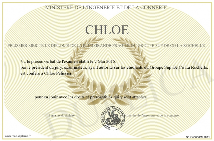 Envoyez par email votre Chloé Pelissier mérite le Diplome de la plus grande FRAGILE du Groupe Sup De Co La Rochelle. personalisé