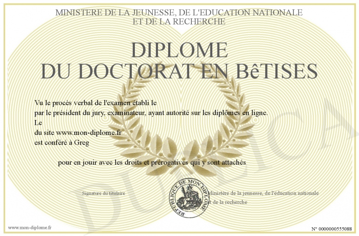 Envoyez par email votre Diplôme du Doctorat en bêtises personalisé