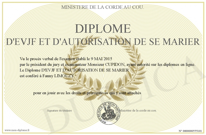 Envoyez par email votre Diplôme D'EVJF ET D'AUTORISATION DE SE MARIER personalisé