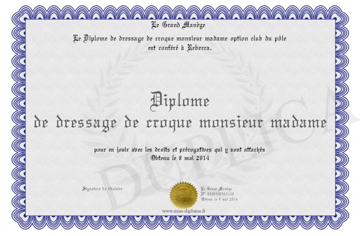 Envoyez par email votre Diplôme de dressage de croque monsieur madame personalisé