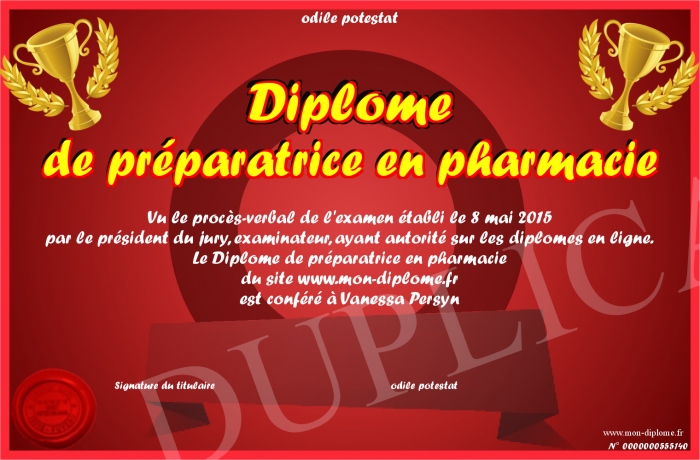 Envoyez par email votre Diplôme de préparatrice en pharmacie personalisé