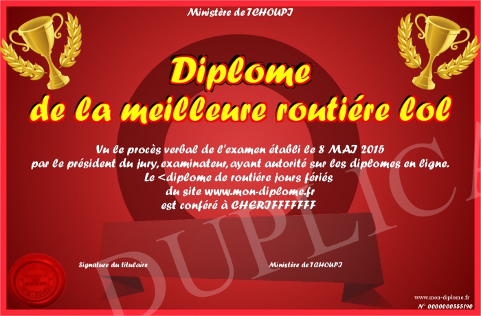 Envoyez par email votre Diplôme de la meilleure routiére lol personalisé