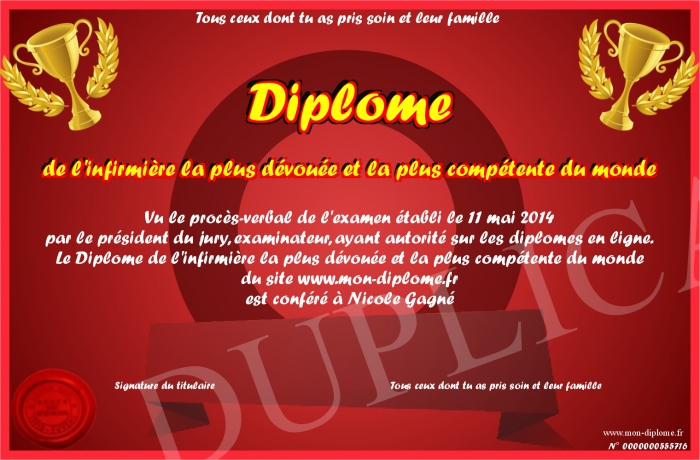 Envoyez par email votre Diplôme de l'infirmière la plus dévouée et la plus compétente du monde personalisé