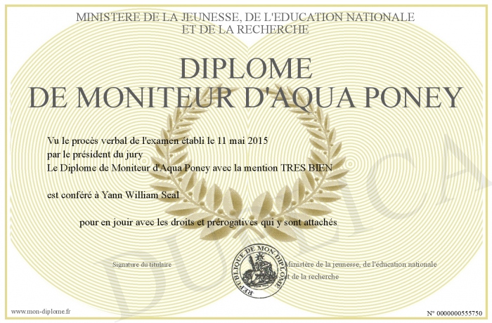 Envoyez par email votre Diplôme de Moniteur d'Aqua Poney personalisé