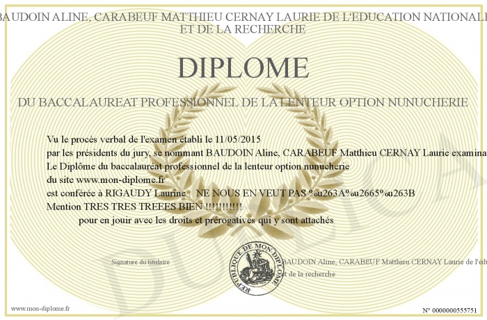 Envoyez par email votre Diplôme du baccalauréat professionnel de la lenteur option nunucherie personalisé
