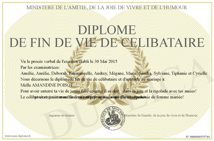 Envoyez par email votre Diplôme de fin de vie de célibataire personalisé