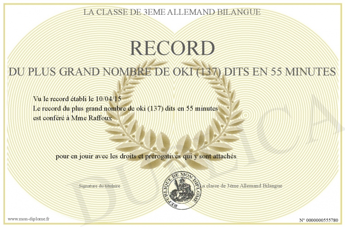 Envoyez par email votre record du plus grand nombre de oki (137) dits en 55 minutes personalisé