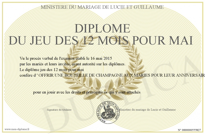 Envoyez par email votre Diplôme du jeu des 12 mois pour mai personalisé
