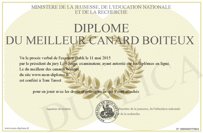 Envoyez par email votre Diplôme du Meilleur canard boiteux personalisé