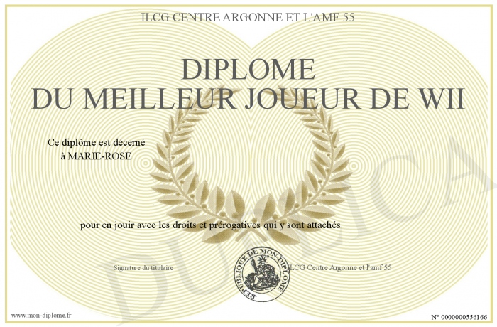 Envoyez par email votre Diplôme du meilleur joueur de Wii personalisé