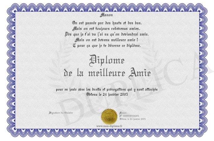 Envoyez par email votre Diplome de la meilleure Amie personalisé