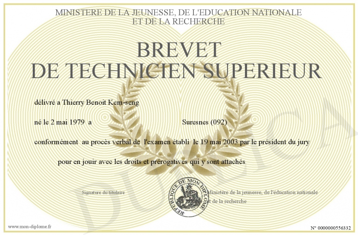 Envoyez par email votre BREVET DE TECHNICIEN SUPERIEUR personalisé