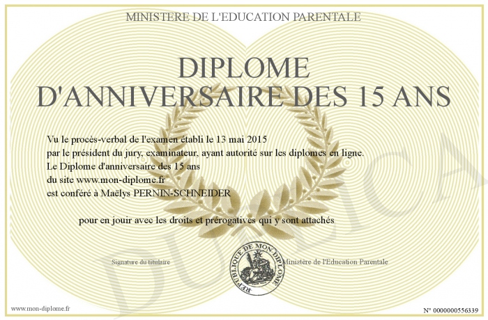 Envoyez par email votre Diplôme d'anniversaire des 15 ans personalisé