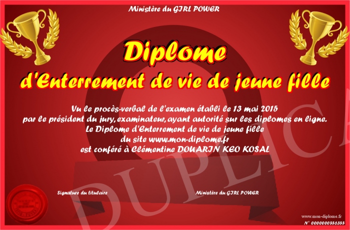 Envoyez par email votre Diplome d'Enterrement de vie de jeune fille personalisé