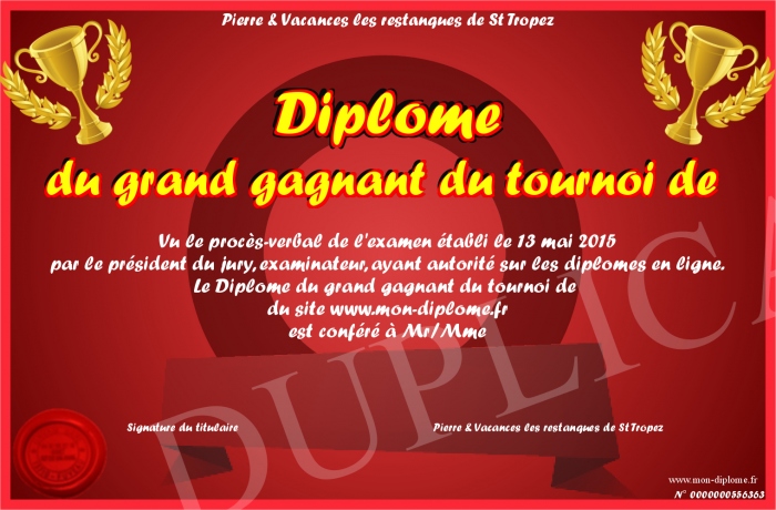 Envoyez par email votre Diplome du grand gagnant du tournoi de personalisé