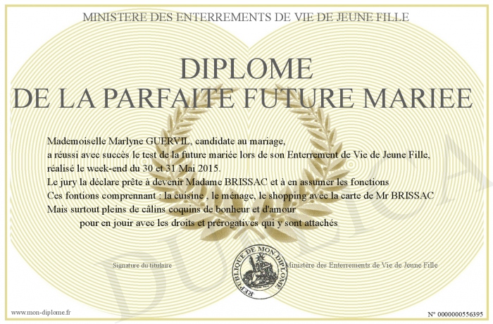 Envoyez par email votre Diplôme de la parfaite future mariée personalisé