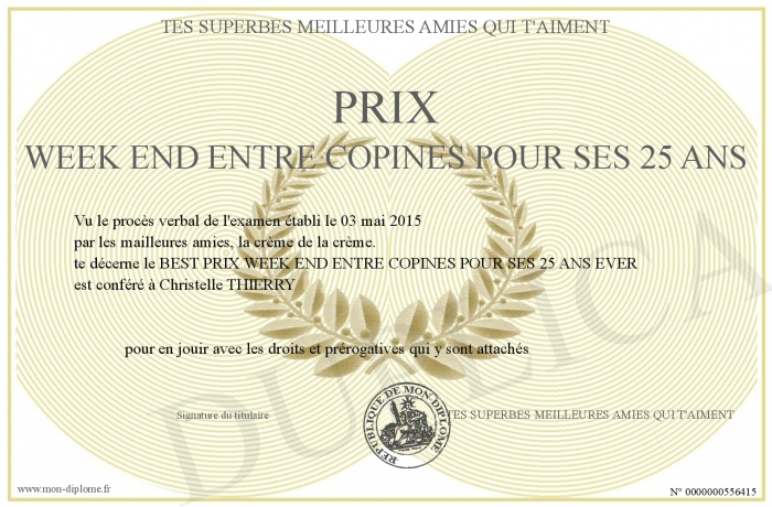 Envoyez par email votre PRIX WEEK END ENTRE COPINES POUR SES 25 ANS personalisé