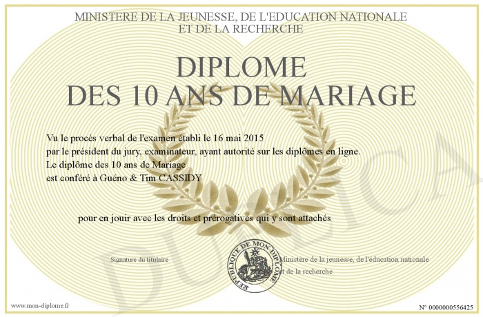 Envoyez par email votre Diplome des 10 ans de Mariage personalisé