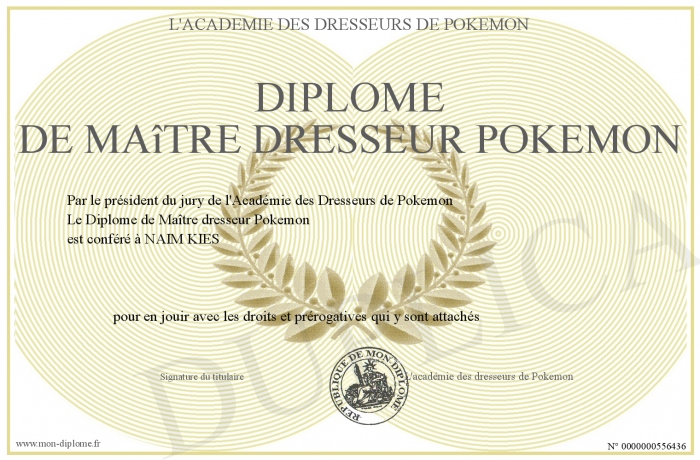 Envoyez par email votre Diplôme de Maître dresseur Pokemon personalisé