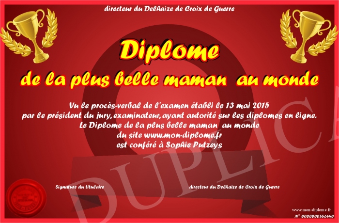 Envoyez par email votre Diplome de la plus belle maman au monde personalisé