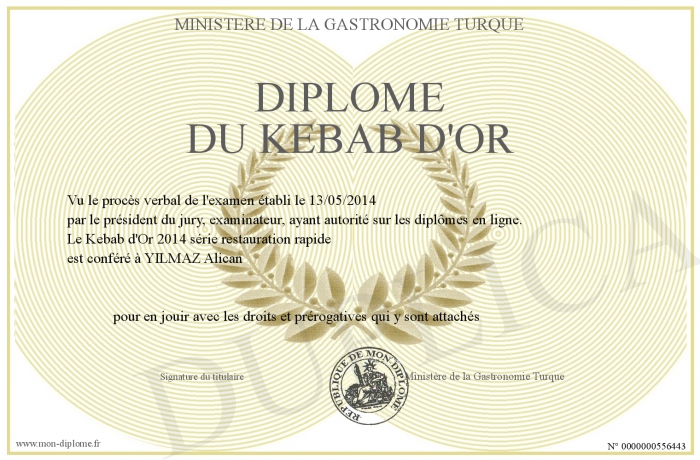 Envoyez par email votre Diplôme du Kebab d'Or personalisé