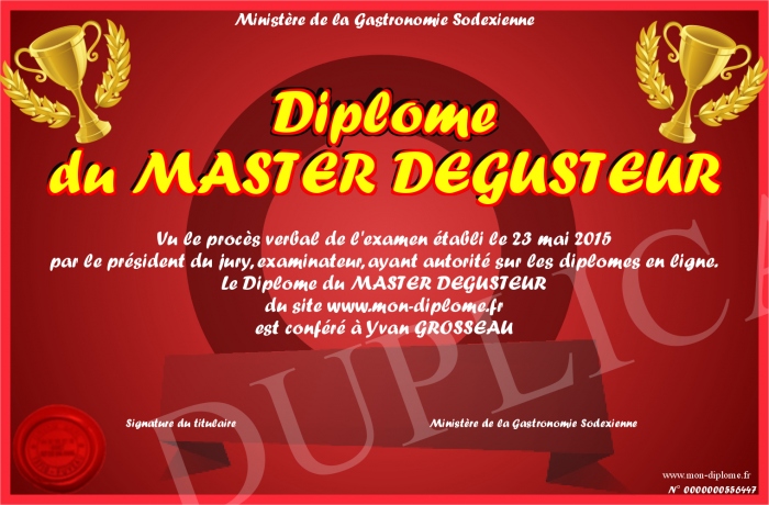 Envoyez par email votre Diplôme du MASTER DEGUSTEUR personalisé