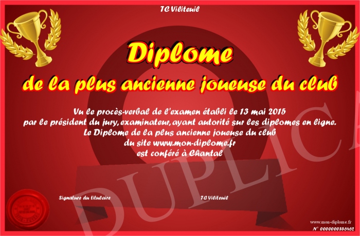Envoyez par email votre Diplôme de la plus ancienne joueuse du club personalisé