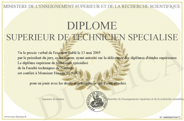 Envoyez par email votre Diplôme Supérieur de Technicien Spécialisé personalisé