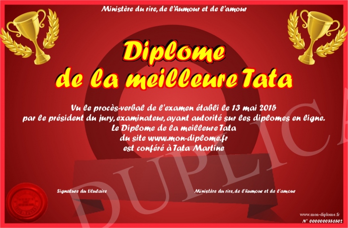 Envoyez par email votre Diplôme de la meilleure Tata personalisé