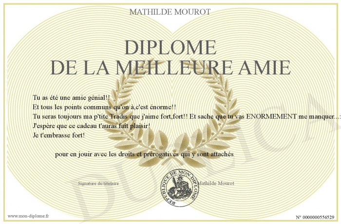 Envoyez par email votre Diplome de la meilleure amie personalisé