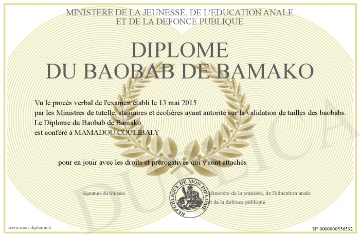 Envoyez par email votre Diplôme du Baobab de Bamako personalisé