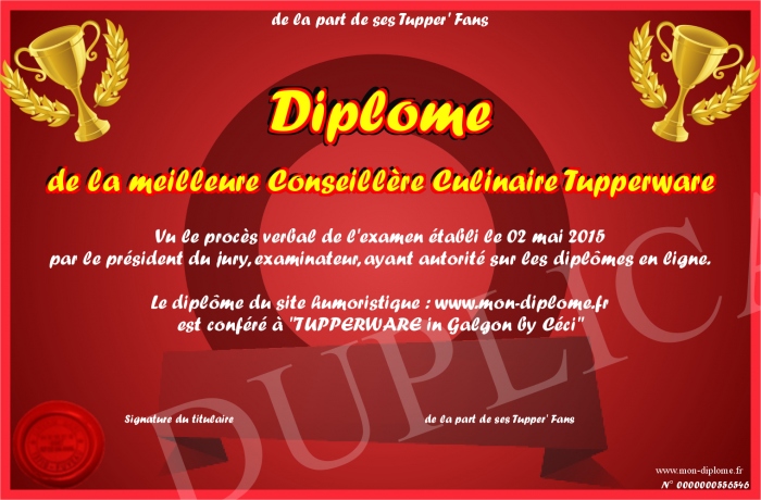 Envoyez par email votre Diplôme de la meilleure Conseillère Culinaire Tupperware personalisé