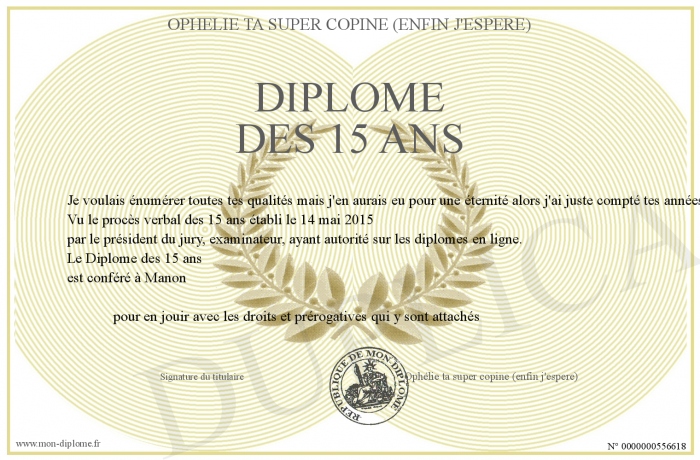Envoyez par email votre Diplôme des 15 ans personalisé