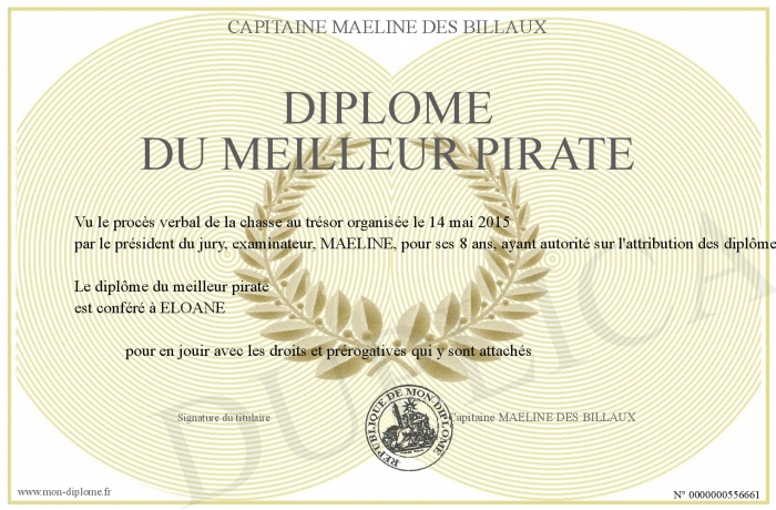 Envoyez par email votre Diplôme du MEILLEUR PIRATE personalisé