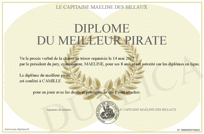 Envoyez par email votre Diplôme du MEILLEUR PIRATE personalisé