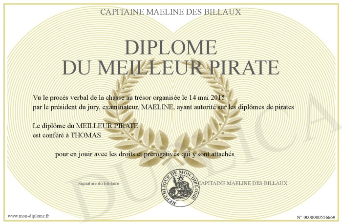 Envoyez par email votre DIPLOME DU MEILLEUR PIRATE personalisé