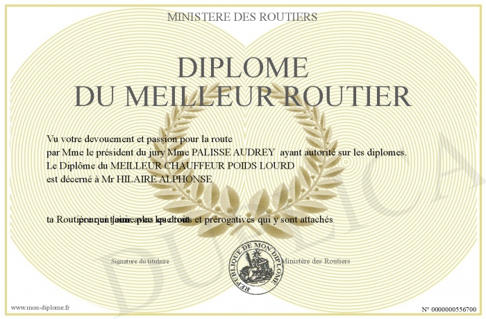Envoyez par email votre Diplôme du MEILLEUR ROUTIER personalisé