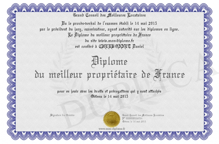 Envoyez par email votre Diplôme du meilleur propriétaire de France personalisé
