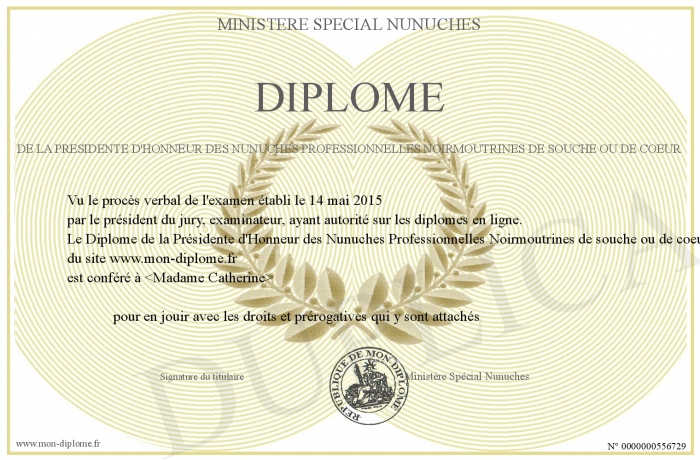 Envoyez par email votre Diplôme de la Présidente d'Honneur des Nunuches Professionnelles Noirmoutrines de souche ou de coeur personalisé