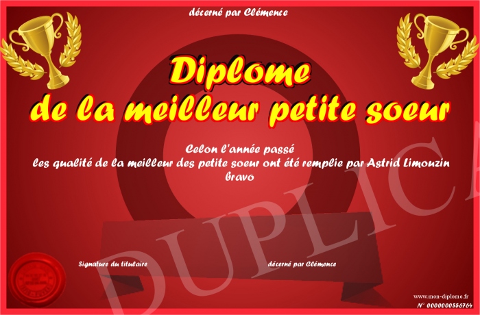 Envoyez par email votre Diplôme de la meilleur petite soeur personalisé