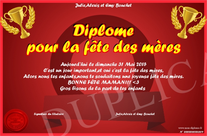 Envoyez par email votre Diplôme pour la fête des mères personalisé